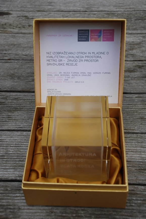 podrobno / Metro SR je na nacionalnem natečaju Zlata kocka 2014, ki jo podeljuje Zbornica za arhitekturo in prostor Slovenije kot del mednarodnega natečaja, ki ga razpisuje Svetovna zveza arhitektov (UIA), prejeli nagrado v kategoriji "ustanove" za niz izobraževanj otrok in mladine o kvalitetah lokalnega prostora.