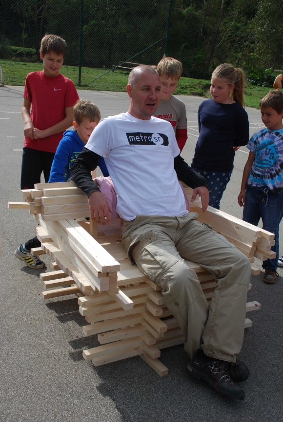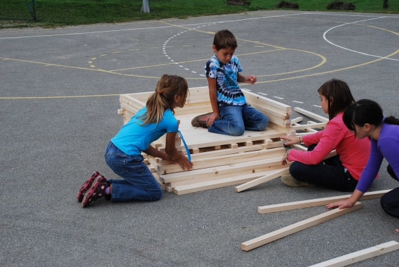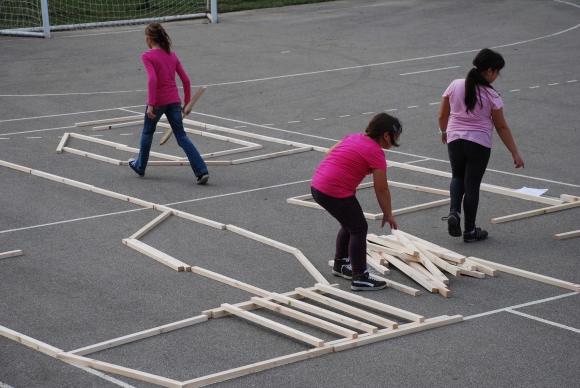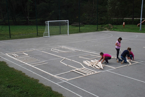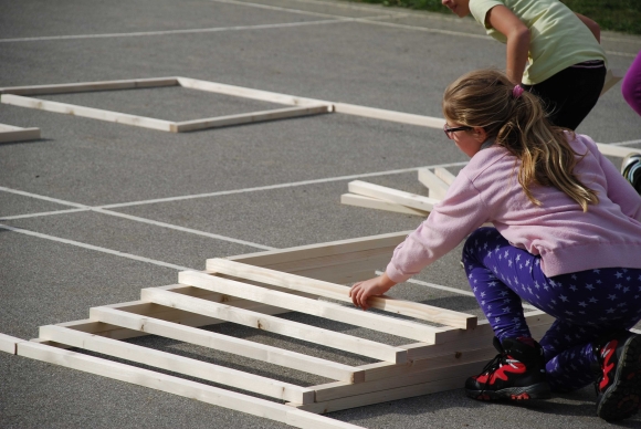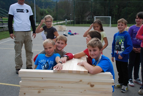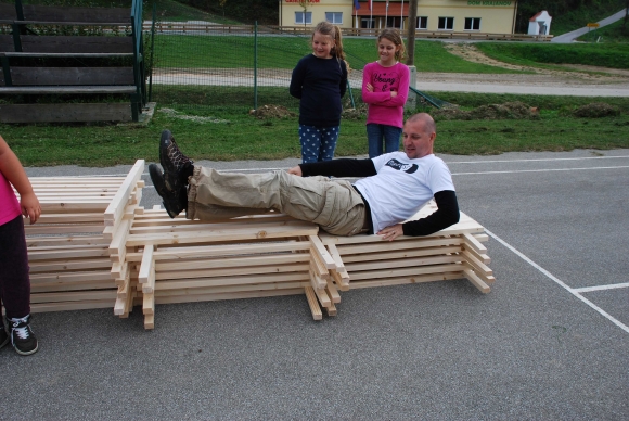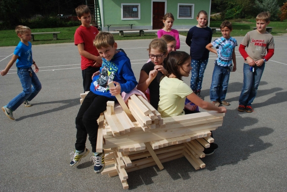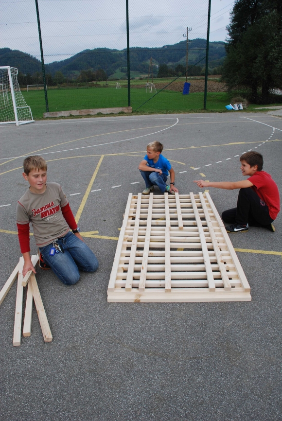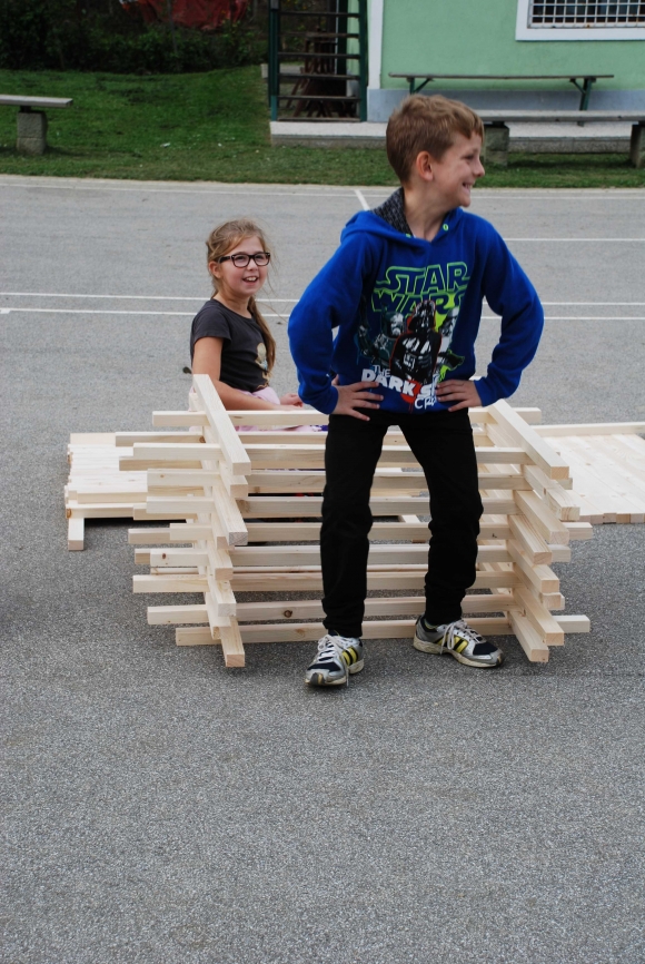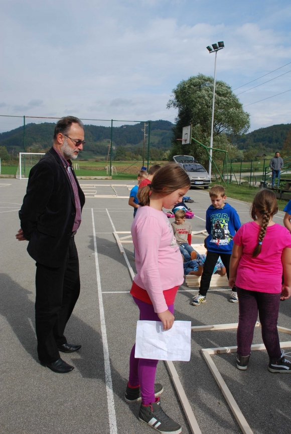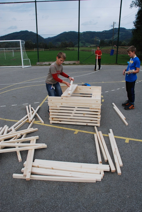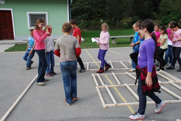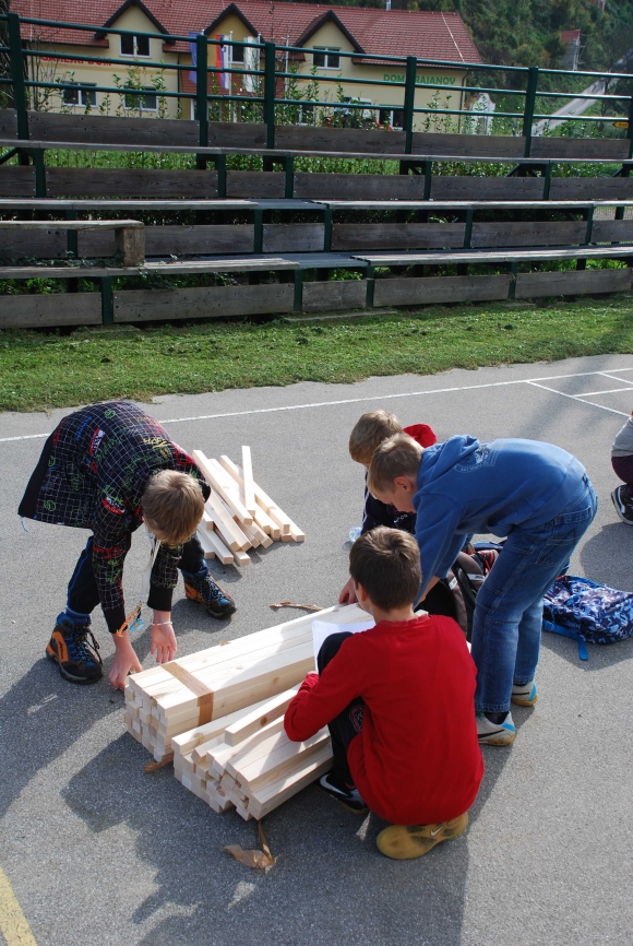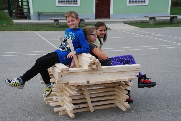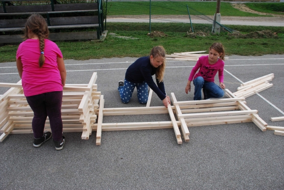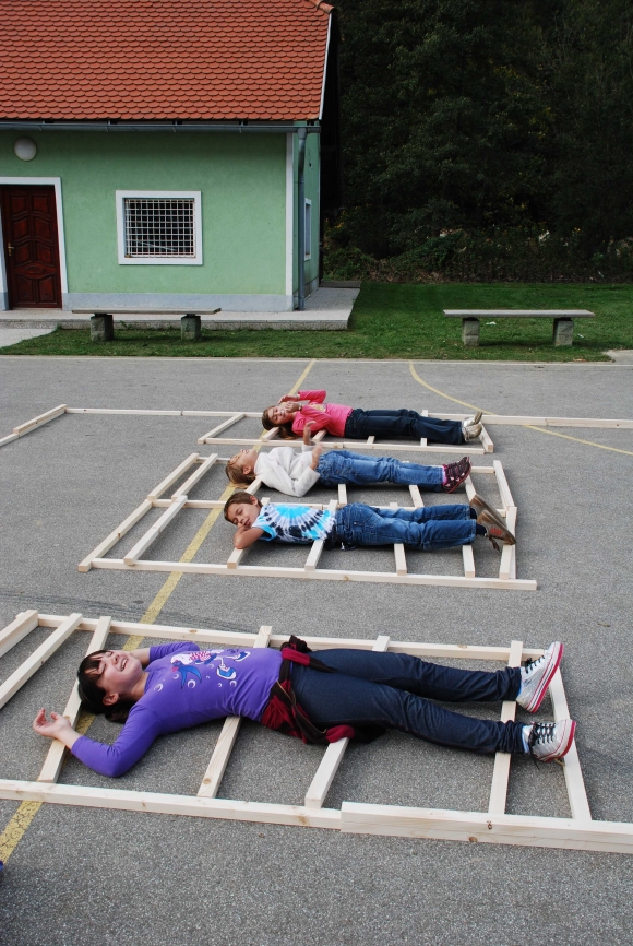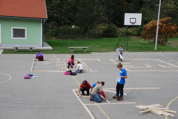koncept delavnice / Javni zavod Kozjanski park izvaja projekt Sodobna arhitekturna tipologija na Kozjanskem, v okviru katerega smo želeli tudi mlade spodbuditi k razmisleku, kako hiša vpliva na občutljiv prostor Kozjanskega parka. Tako že naslov delavnice asociira na dvojen pomen, prvič se hiša nahaja v neurbanem okolju parka, drugič pa jo najdemo v zavarovanem območju s statusom regijskega parka. Delavnico smo prilagodili četrtošolcem. V prvem delu smo spoznavali kulturno krajino Kozjanskega ter prostor Kozjanskega zaznavali z vsemi čutili. V drugem delu smo narisali načrt kozjanske hiše in tlorise v merilu 1:1 z letvicami prikazali v dejanskem prostoru. Sprehodili smo se po štirih novih hišah, ki so jih načrtovali in izvedli četrtošolci in v njih odkrivali elemente tipične kozjanske hiše. Ob zaključku delavnice smo iz tradicionalnega materiala, lesenih letvic naredili štiri nove kose urbanega pohištva, ki smo jih seveda tudi preizkusili.