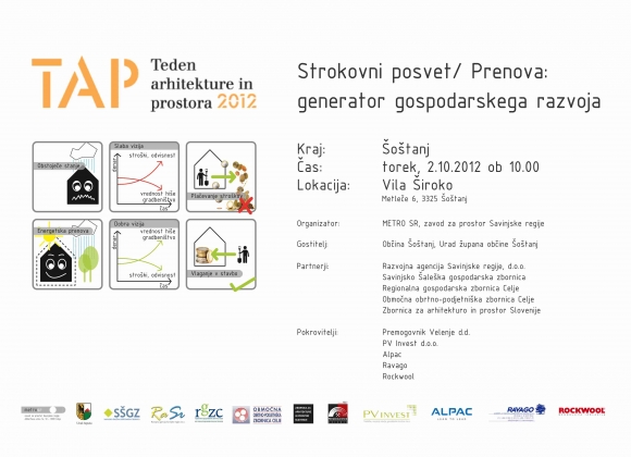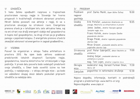 izvedba posveta / Posvet bo organiziran v sklopu Tedna arhitekture in prostora 2. oktobra 2012. Zasnovana bo kot strokovni posvet, na katerem bodo aktivno sodelovali predstavniki Savinjske regije, gospodarstva, resorna ministrstva ter strokovnjaki s tega področja. V prvem delu posveta bodo sodelujoči predstavili svoja izhodišča, s čimer bodo osvetlili izzive na tem področju, v nadaljevanju - v sklopu okrogle mize - pa bodo vsi udeleženci skupaj skozi debato poskušali pripraviti izhodišča za nadaljnje delo.