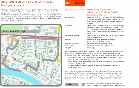 V letošnjem letu se Celje že drugič pridružuje globalni akciji urbanih sprehodov, ki pod imenom ''Jane's Walk'' po celem svetu potekajo prvi vikend v mesecu maju. Sprehodi obeležujejo ime in ideje Jane Jacobs, celjski sprehod pa je prav tako kot ostali sprehodi po svetu ozaveščal o pomenu pešačenja po vsakdanjih opravkih - poudarek sprehoda je bil na pomenu pešačenja v šolo, o vplivu pešcev na urejanje mestnega prostora ter na spodbujanju povezovanja prebivalcev s sosedi in sosesko.