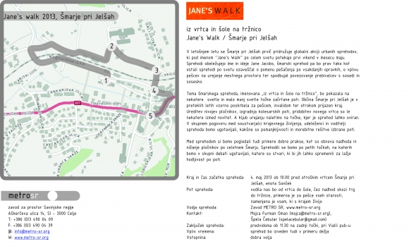 V letošnjem letu se Šmarje pri Jelšah prvič pridružuje globalni akciji urbanih sprehodov, ki pod imenom ''Jane's Walk'' po celem svetu potekajo prvi vikend v mesecu maju. Sprehodi obeležujejo ime in ideje Jane Jacobs, šmarski sprehod pa je prav tako kot ostali sprehodi po svetu ozaveščal o pomenu pešačenja po vsakdanjih opravkih, o vplivu pešcev na urejanje mestnega prostora ter spodbujal povezovanje prebivalcev s sosedi in sosesko.