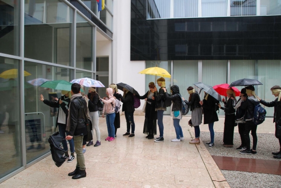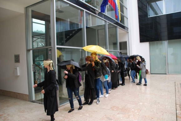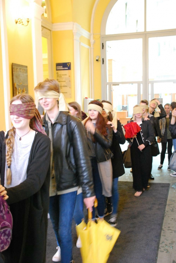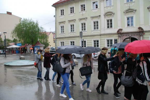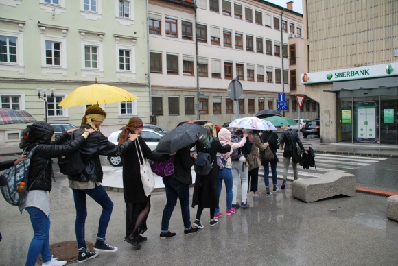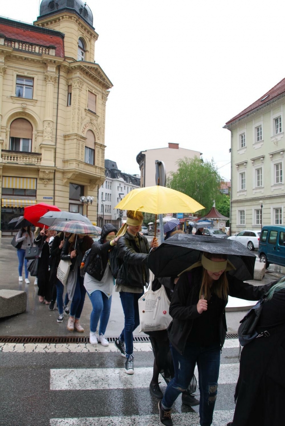 pot sprehoda / Vodila nas bo po starem mestnem jedru. Pot ni javno objavljena, ker želimo sprehajalce spodbuditi, da se po mestu orientirajo brez uporabe vida. Na sprehodu bodo uporabljene preveze za oči.