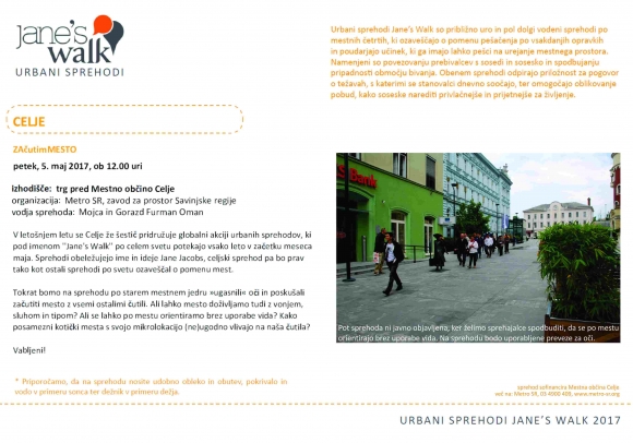 V letošnjem letu se Celje že šestič pridružuje globalni akciji urbanih sprehodov, ki pod imenom ''Jane's Walk'' po celem svetu potekajo vsako leto v začetku meseca maja. Sprehodi obeležujejo ime in ideje Jane Jacobs, celjski sprehod pa bo prav tako kot ostali sprehodi po svetu ozaveščal o pomenu mest. Tokrat bomo na sprehodu po starem mestnem jedru »ugasnili« oči in poskušali začutiti mesto z vsemi ostalimi čutili. Ali lahko mesto doživljamo tudi z vonjem, sluhom in tipom? Ali se lahko po mestu orientiramo brez uporabe vida? Kako posamezni kotički mesta s svojo mikrolokacijo (ne)ugodno vlivajo na naša čutila? Vabljeni!